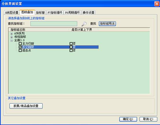 点击k线图上方的设置,调出分析界面窗口,如下图,选择”图线叠加”选项à“全赢3.0” à选中“多空趋势”点击确定就可以调出该指标