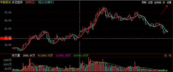 点击k线图上方的设置,调出分析界面窗口,如下图,选择”图线叠加”选项à“全赢3.0” à选中“追击点”点击确定就可以调出该指标