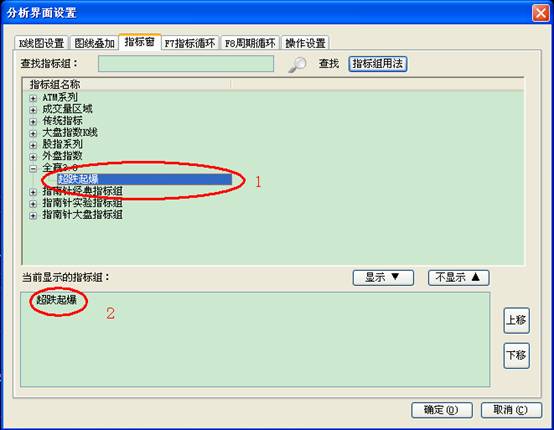 点击k线图上方的设置,调出分析界面窗口,如下图,选择”指标窗”选项à“全赢3.0” à双击“超跌起爆”(图形1处)使其出现在当前显示的指标组里(图形2处)。在当前显示的指标组里,可以对当前显示的指标的位置进行操作,如上移、下移。点击确定,就调出该指标。