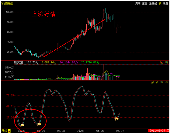 标识指的是在指标波形图中连续两三个波底之内)如下图
